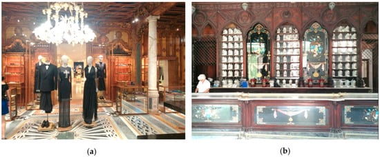 Old aesthetic styles and contemporary functions: (a) modern shop equipment in a historic and well-decorated interior (fashion store in Venice); (b) antique and original shop equipment (pharmacy in Havana).