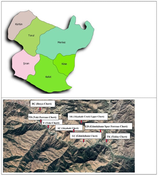 The study employed CEM I 42.5 R cement, nonreactive limestone for reference sample production, and chert samples with different chemical compositions from the Gumushane region, named TD, T, AK, GD, AC, GC, BC, and TK, as well as tap water. The origin locations of the aggregates used are provided in Figure 2 and field image Figure 3.