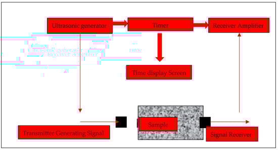 The ultrasonic velocity measurement on the prepared concrete samples was determined according to ASTM C597 []. Ultrasonic velocity measurement was applied to concrete samples with cherts, and the operating principle of the device is provided in Figure 4. The device operates on the principle of measuring the propagation speed of the wave in the medium based on the reactions received by the receiver and transmitter sensors. The ultrasonic wave velocity test was applied to 25 × 25 × 285 mm prismatic samples. The samples were placed horizontally in the device for wave velocity measurement. Each sample was divided into three sections, and measurements were made for each section. These sections were divided into upper, middle, and lower, and three measurement values were taken for each section. The average of these 3 values reflecting the sample was calculated to obtain the result. During the measurement, the device’s heads were designed to be in the same line and parallel to each other in the horizontal position of the sample. The sample heads were placed in a way that did not create gaps in the sample during the measurement, and the results obtained were calculated according to Equation (9).