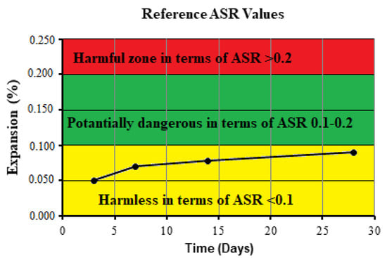 In this study, chert samples with eight different chemical compositions were collected from various regions within the borders of Gumushane province, and for the comparison of results, limestone aggregate, which is accepted as a reference, was used. The cherts that are widespread in the region were evaluated for their potential to be an alternative concrete aggregate if used in concrete plants, which was determined using the alkali–silica reaction (ASR) elongation values. In this study, the ASTM C1260 Standard Test Method for Potential Alkali Reactivity of Aggregates (mortar-bar method) was employed to determine the alkali–silica reactivity of eight aggregates from different origins [,]. Sometimes, even if the aggregate is not reactive, different components may become reactive in a high alkali environment, leading to the occurrence of ASR [].