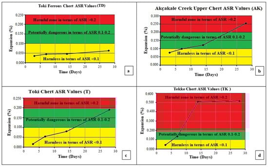 ASR expansion change values of different chert samples (a) Toki Ferrous chert (TD), (b) Akçakale Creek Upper chert (AK), (c) Toki chert (T), (d) Tekke chert (TK).