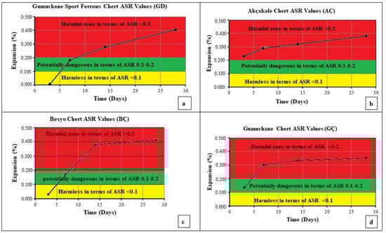ASR expansion change values of different chert samples (a) Gumushane Sport Ferrous chert (GD), (b) Akcakale chert (AC), (c) Besyo chert (BC), (d) Gumushane chert (GC).