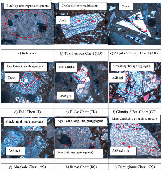 To determine the post-ASR elongation values of cherts with different characteristics, accelerated mortar-bar tests in accordance with ASTM C 1260 [] standard, ultrasonic P-wave velocity measurements, and compression and flexural strength tests were conducted. Additionally, thin-section tests were performed for microstructure examinations (Figure 4).