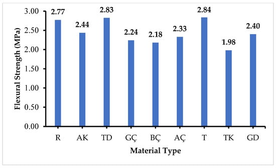 Flexural strength tests were conducted on the cork samples with different components subjected to ASR. The test was carried out using a concrete press with a capacity of 200 tons and a loading speed of 50 N/s according to the TS EN 196-1 [] standard. The samples, which had been completed during periods of 3, 7, 14, and 28 days and had measured ASR elongation values, were used for the tests. The prepared prismatic specimens were placed in the flexural apparatus, and loading was initiated. Due to the effect of the applied force (P) during loading, the specimens were split in half. The obtained measurement values were used to calculate the unknowns in Equation (11), and the flexural strength values were determined.