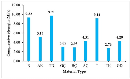 After determining the ASR length measurement values for the prepared 3 samples with dimensions of 25 × 25 × 285 mm at 3, 7, 14, and 28 days of curing, a flexural test was conducted by first splitting them in half. Three samples were divided into two equal parts, resulting in six specimens. A compressive strength test according to the TS EN 196-1 [] standard was applied to each specimen. After placing 40 × 40 × 40 mm-sized metal crushing heads on the lower and upper surfaces of each specimen, a compressive test was conducted. The arithmetic average of the obtained results from the 6 tests was taken, and the uniaxial compressive strength values were determined by dividing the measured breaking force (F) in the device by the cross-sectional area of the specimen, as given in Equation (10).