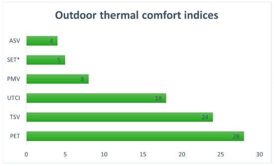 Figure 2 shows the Köppen–Geiger climatic classification of the studies. A total of 25% of the studies were conducted in Hot-summer Mediterranean climate (Csa), 19% in Monsoon-influenced humid subtropical climate (Cwa), followed by Tropical savanna, wet (Aw), Humid subtropical climate (Cfa), and Cold semi-arid (steppe) climate (Bsk), 10% each. Thus, most of the study types had warm-to-hot climatic types as opposed to the cold ones used for developing the indices. Figure 3 reveals indices for developing neutral thermal comfort or estimating prediction accuracy. Though bio-climatic UTCI is considered better than PET as the former can calculate dynamic activity levels, 28 studies used PET as the main index, and UTCI was applied by 18. TSV was evaluated by most studies (24) to compare with the prediction accuracy of the index. Several studies also used multiple indices simultaneously to determine the accuracy.