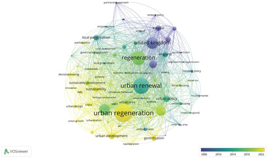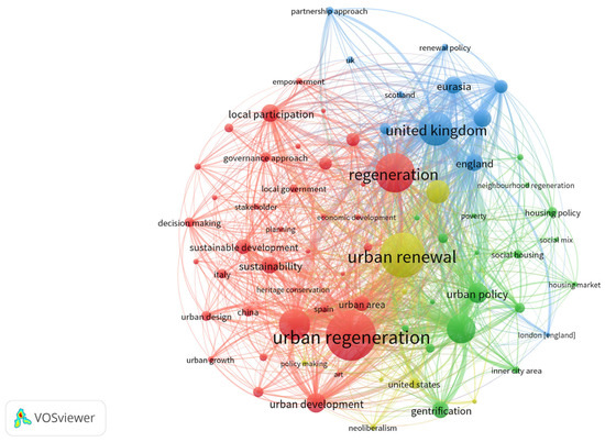 Each cluster encompasses a keyword list detailing the determinants influencing community regeneration through the lens of social sustainability. These clusters are distinguished by various colors. In red are pivotal terms central to CR, such as urban design, urban regeneration, urban development, sustainable development, government decision-making, regeneration, local participation, and economic development. In green are keywords related to social sustainability, such as neighborhood regeneration and housing policies, social mix, social welfare housing, poverty, inner-city areas, etc. Light blue denotes keywords associated with community regeneration within social sustainability across different regions, such as the United Kingdom, Eurasia, and Scotland. Yellow represents terms related to urban regeneration, neoliberalism, policy-making, and other relevant concepts.