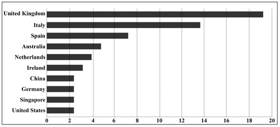 The spatial network illustrates the geographical connections among the authors of the articles. Among 62 countries, 22 reached the spatial network threshold, defined as having at least 15 documents and zero citations. Figure 5 highlights the top-ten ranking countries. The vertical axis (y) in the figure represents countries, while the horizontal axis (x) represents the percentage of publications from the public sector. The United Kingdom makes the most substantial research contribution to CR from the SSP, accounting for approximately 19.2% of publications. Following closely, Italy ranks second in publication output, contributing 13.8% (see Figure 6).