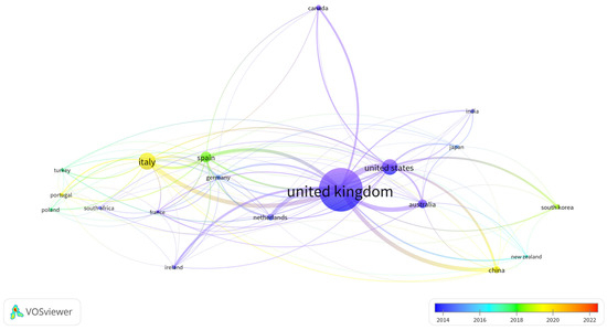 On the flip side, the temporal network analysis presented in Figure 6 delineates the leading nations in CR research from the SSP during the period spanning 2014 to 2022 (with each country contributing a minimum of 10 publications). In this context, the size of nodes corresponds to the frequency of documents originating from each respective country, with larger nodes denoting higher publication frequencies. Nodes, differentiated by color, represent distinct periods over time. Figure 7 reveals that, up until 2014, the leading nations in CR research from the SSP included the United Kingdom, the United States, Japan, Australia, and Canada. Following closely behind were Spain, South Africa, and Turkey, during the period from 2016 to 2018. The visualized network indicates extensive research on CR from the SSP in China post-2018. The thickness of the links in the graph highlights the close connections between China, the United Kingdom, Australia, Italy, the United States, and Spain.