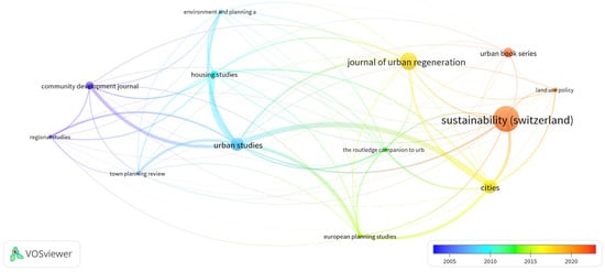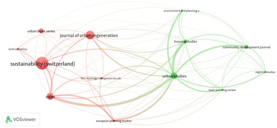 In the red cluster, there are journals such as “Sustainability,” “Journal of Urban Regeneration,” “Land Use Policy,” “Cities,” “European Planning Studies,” and the “Urban Book Series.”
