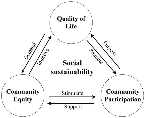 Based on the interpretation and literature synthesis ahead, the manifestation of social sustainability at the community scale can be summarized into three aspects: social equity, social capital, and social inclusion [22,23]. As defined by Caulfield, social sustainability encapsulates communities’ capacity to autonomously enhance and improve [24], representing a crucial strategy for urban regeneration [25]. Socially sustainable regeneration focuses on improving the QoL, enhancing social participation and equity, and promoting community development [13,16,26]. Scholars have delved into socially sustainable development’s nuanced characteristics and connotations, contending that its essence lies in cultivating “quality of life” within urban communities [27,28]. This involves a concerted effort to ameliorate community housing and the built environment by understanding residents’ needs and bolstering their engagement in community activities.