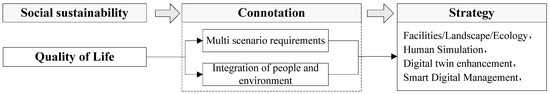This multifaceted cultivation of QoL within diverse scenarios aligns with current policy directions, including well-organized commercial service facilities, holistic municipal supporting facilities, ample public activity spaces, comprehensive property management, and sound community management mechanisms [64,65,66]. Simultaneously, the cultivation of QoL in new scenario demands necessitates integration with the development of new technologies, including the use of artificial intelligence to simulate individual demands for usage scenarios, employing digital twin mappings, such as sensor technology and monitoring systems, to comprehensively record community environmental conditions, allowing spatial responses to be data-driven, achieving digital twinning and scenario simulation [67]. This requires intelligent digital management to enhance individuals’ perceptions of QoL (Figure 10).