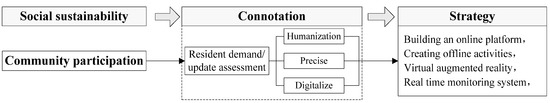 Based on the above, the implementation pathway for socially sustainable regeneration of communities revolves around a multidimensional alignment of ‘QoL–community participation–community equity.’ It necessitates a foundation in diverse community involvement to thoroughly acquire intentions and demands for renovation and transformation [99]. Subsequently, while considering community equity as a prerequisite, it is imperative to factor in the interests of the majority in decision-making and funding procurement, particularly in addressing the demands of vulnerable groups. Ultimately, this combines people and the environment, carefully enhancing the community’s QoL.