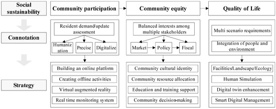 Social sustainability represents a multidimensional concept [17], closely intertwined with issues within society, such as economic inequality, social disparities, immigrant settlement, and livability [36,37]. In the CR domain, the boundaries and definition of social sustainability have sparked debates due to its encompassment of various dimensions, including theory, policy, and practice. Over the past decade, numerous scholars have explored social sustainability from diverse perspectives. Some have examined it from a policy standpoint, discussing the relationship between democracy, fairness, and social sustainability [20,38]. Others have focused on the developmental aspects, emphasizing the linkage between community spatial environments and social sustainability [39]. Additionally, viewpoints that underscore participatory entities have brought attention to the societal consequences of community engagement, delving into the social dimensions inherent in urban sustainable transformations [40,41,42]. However, a comprehensive exploration of social sustainability at the community scale remains lacking [25].