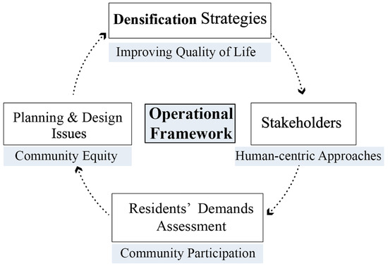 Densification represents a pragmatic and sustainable approach to CR from the SSP and holds the potential for integrative and inclusive goals, ensuring the realization of social justice [114,115]. Simultaneously, through densification, the enhancement of interactions between residents and public spaces and the creation of appropriate public facilities and cultural spaces are facilitated, thereby supporting a vibrant community living environment [116,117]. Indeed, linking pathways, such as community engagement and social equity, to the implementation of densification requires a comprehensive operational framework that fundamentally associates individual stakeholders’ recognition of regeneration implementation (Figure 14): measuring resident needs, balancing various stakeholder demands, and fully considering various elements at the planning level, such as policy guidance and spatial design requirements. Synthesis of all these contents, formulating the co-related densification solutions and implementation strategies, can achieve appropriate and targeted improvement in community QoL [118,119]. Notably, with the continuous evolution of society, residents’ demands and expectations undergo constant changes. Once it is observed that the existing spatial environment and management approaches are no longer suitable, a progressive and dynamic CR guided by this operational framework should be initiated.