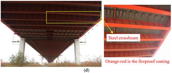 Sifangtai Highway Bridge is located on the Songhua River in Harbin, China. It is an important bridge connecting the south and north transportation systems of Harbin. The total length of the bridge is 696 m, with spans arranged at 44 m (transition span) + 136 m (side span) + 336 m (middle span) + 136 m (side span) + 44 m (transition span). It is a double tower cable-stayed bridge, and the bridge layout is shown in Figure 1a,b. This bridge has a 33.2 m wide deck carrying four traffic lanes. The beam is a steel–concrete composite beam with a prestressed concrete bridge deck on the upper side which has a thickness of 0.25 m and a concrete grade of C60. The steel longitudinal beam on the lower side employs three I-beams arranged symmetrically, with a height of 1.95 m on both sides and 0.55 m in the middle. Longitudinal beams are connected by steel crossbeams, with stiffeners installed every 1.65 m, and pedestrian cantilever steel beams are installed on both sides. The fireproof material used for the steel structure in the steel–concrete composite beam is a thin steel structure fireproof coating, which is brushed on during construction to prevent fire in the steel structure. The bridge cross-section and the steel crossbeam are shown in Figure 1c,d.