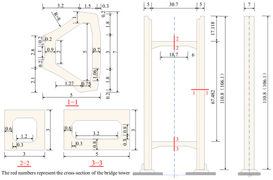The bridge tower is a portal tower, with the south tower reaching a height of 110.80 m and the north tower reaching a height of 106.10 m, with a single chamber hexagonal cross-section. The bridge tower is equipped with two horizontal beams, upper and lower, dividing it into three parts: upper, middle, and lower tower columns. The crossbeam is a hollow box girder, the upper crossbeam is 3.0 m × 3.0 m, and the lower crossbeam is 5.0 m × 3.0 m. The bridge tower is shown in Figure 2.
