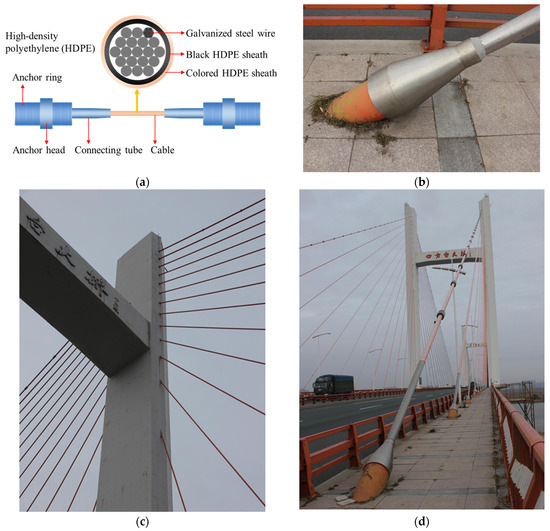 Due to the fact that the stay cables are located above the bridge deck and are usually close to the carriageway, the probability of a fire occurring in the stay cables is self-evident. At present, the cables of cable-stayed bridges are usually wrapped with high-strength steel wires or steel strands contained within high-density polyethylene (HDPE) sheaths. The fusing point of the polyethylene sheaths is low, which leads to a weak point of poor high-temperature performance inside the cable protection sleeve [4,5,6,7]. If a fire occurs and causes the cables to catch fire, it is particularly important to evaluate the cable-stayed bridge in a timely and effective manner [8,9,10].