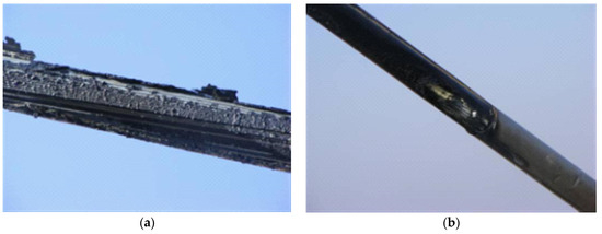 In 2011, a traffic accident occurred on the bridge, causing a car to catch fire and burn near cables. The damaged cables were N12 and N13, upstream of the north bank. The PE protective material of two cables was partially burned, and both wires were exposed. The burnt length of N12 was 16.5 m, and the burnt length of N13 was 5 m. After removing the burnt material and exposing the cable steel wire, it was found that the surface color of the steel wire had changed to a certain extent. The damaged condition of the cable is shown in Figure 4.