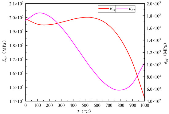 When a cable is damaged by fire, any fused steel wires are completely out of service. For unfused steel wires, the elastic modulus and ultimate strength are calculated based on the material properties of the steel after high temperatures [7]. The material properties of prestressed steel wire will change after undergoing high temperature effects. Under air cooling, the degradation law of the elastic modulus and ultimate strength of the steel wire at a given temperature conforms to Equations (1) and (2), and the corresponding change curve is shown in Figure 5.
