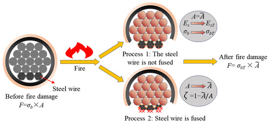 When simulating the fire damage, the cables are first segmented and divided into damaged and non-damaged areas. The elastic modulus and ultimate strength of cables in the non-damaged area remain unchanged. The elastic modulus and ultimate strength of the steel wire after high temperature for cables in the damaged area are reduced according to Equations (1) and (2). Finally, the bearing capacity of the cable after fire damage is calculated according to Equations (3) and (4).