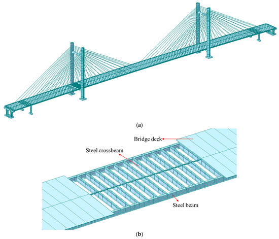 A bridge model was established using the finite element software MIDAS CIVIL/2021 (v1.1), with a total of 1933 nodes and 2272 elements. Verification of different unit division lengths was conducted for the natural frequency and deflection of cable-stayed bridge structures, ensuring the accuracy of the analysis. The overall finite element model of the Sifangtai Bridge is shown in Figure 7a, and the basic parameters of the bridge model are as follows.