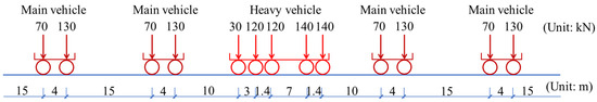 The static performance response of the bridge under vertical loads was used as the basis for static analysis. Vertical loads include the self weight of the beam, secondary loads, and vehicle loads. The static analysis of this bridge is a holistic analysis, which uses lane loads for loading, and designed according to the requirements of Class 20 for automobiles. Each lane consists of one heavy vehicle and several main vehicles, with one heavy vehicle weighing 550 kN and one main vehicle weighing 200 kN. Due to this bridge being a two-way four-lane road, the vehicle load is reduced laterally by 33% [47]. The layout of lane loads is shown in Figure 8.