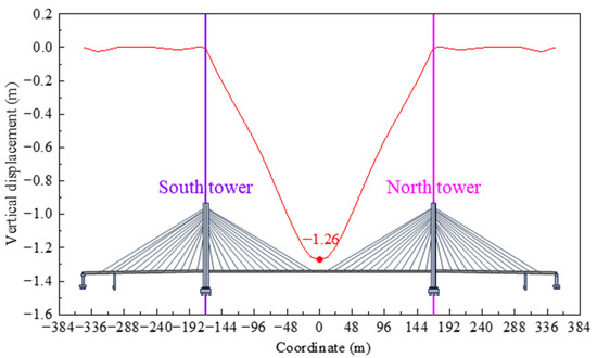 Figure 9 shows the vertical displacement variation of the beam under loads. The horizontal axis is based on the mid span of the bridge, dividing the bridge into two parts: the south tower and the north tower. The vertical axis represents the vertical displacement of the beam. As can be seen in Figure 9, the vertical displacement of the mid span beam varies greatly, while the vertical displacement of the side span beam remains almost unchanged. This indicates that the support effect of the bridge towers and transition piers on both sides hinders the vertical expansion of the beam to the outside. The maximum vertical displacement of the beam is 1.26 m, which occurs in the middle section of the mid span and gradually decreases towards the bridge towers on both sides.