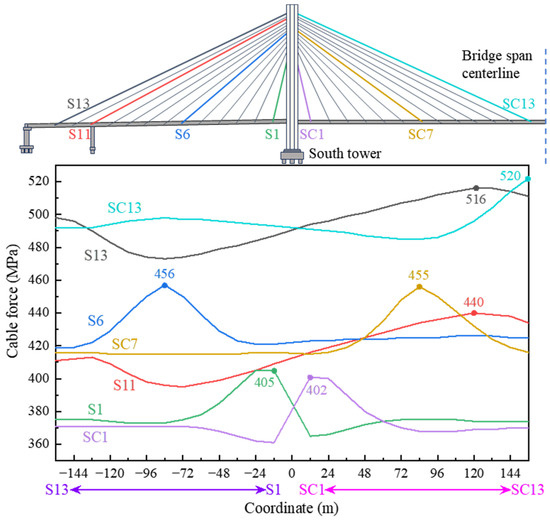 Figure 10 shows the variation in cable force of typical cables (S13, S11, S6, S1, SC1, SC7, SC13) when the vehicle load moves longitudinally along the beam. The horizontal axis represents the position of the load, and the vertical axis represents the cable force value of typical cables. As can be seen in Figure 10, the cable forces of S13, S11, and SC13 constantly change during the vehicle’s movement. The trend of cable force changes in S13 and S11 is the same, while S13 and SC13 are opposite. This is because S13 and S11 are cables on the same side of the bridge tower and are closer in distance, while SC13 and SC11 are cables on opposite sides and symmetrical to the bridge tower. When the vehicle load acts on the middle section of the mid span, the maximum changes in cable forces for S13, S11, and SC13 are 516 MPa, 440 MPa, and 522 MPa, respectively. This indicates that in the middle section of the mid span, the vehicle load is mainly transmitted to the upper part of the bridge tower through cable SC13. The smaller stiffness of the upper part of the bridge tower produces a larger horizontal displacement, causing several cables to increase their force significantly, and to change continuously in order to prevent deformation. Therefore, the vehicle load has a significant impact on the forces of the upper cable of the bridge tower in the mid span.
