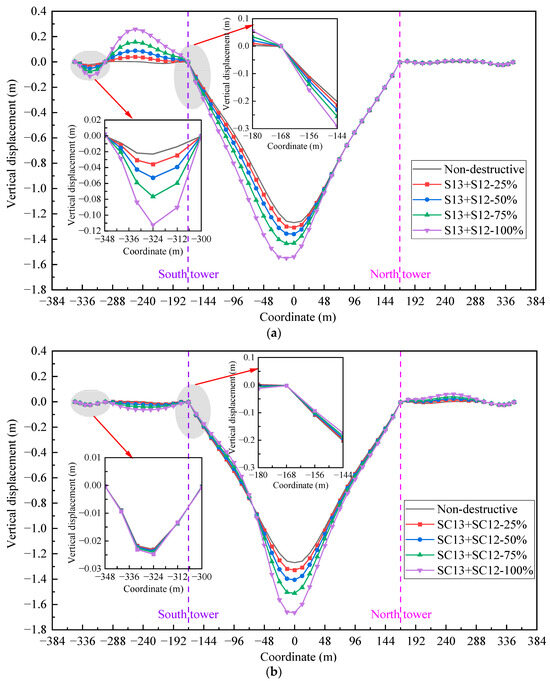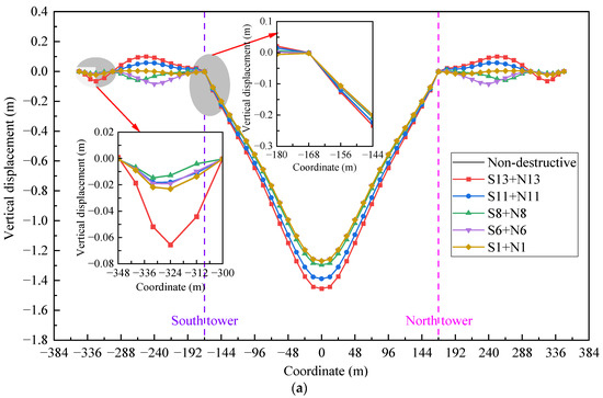 As can be seen in Figure 11a, the fusing of upper cables S13 + N13 of the bridge tower has the greatest impact on the deflection of the beam, followed by S11 + N11. The maximum deflection of the mid span is 1455.1 mm and 1388.7 mm, respectively, and the maximum deflection of the side span is 99.8 mm and 57.3 mm. This is because after the upper cable fusing of the bridge tower, the cables (SC13 + NC13) at the corresponding position of the mid span are subjected to unbalanced forces. The smaller stiffness in the upper and middle parts of the bridge tower causes the tower to tilt towards the mid span, resulting in a downward deflection of the mid span beam. The upper and middle cables (S12~S9, S8~S5) on the same side are subjected to more redistributed loads, resulting in an increase in cable force and an upward deflection of the side span beam (as shown in Figure 12a ②). The fusing of middle cables S8 + N8 and S6 + N6 of the bridge tower has a relatively small impact on the deflection of the mid span beam, but a significant impact on the deflection of the side span. The maximum deflection of the mid span is 1296.2 mm and 1269.7 mm, respectively, and the maximum deflection of the side span is 60.1 mm and 75.4 mm. This is because after the fusing of the middle cable of the bridge tower, the upper cables (SC13~SC9) of the mid span are less affected and only produce a small displacement towards the mid span. The upper and middle cable forces (S13~S9, S8~S5) on the same side increase, and the smaller stiffness in the upper and middle parts of the bridge tower causes the tower to tilt outward under greater tension, resulting in a significant downward deflection of the beam in the middle section of the side span after losing some forces (as shown in Figure 12a ③). The fusing of lower cables S1 + N1 of the bridge tower has the same impact on the deflection of the entire bridge as the undamaged state. This is because after the fusing of the lower cables of the bridge tower, the cables on the same side share the load, and the lower part of the bridge tower has a large stiffness, which prevents displacement of the bridge tower, meaning there is no significant change in the shape of the beam (as shown in Figure 12a ④).
