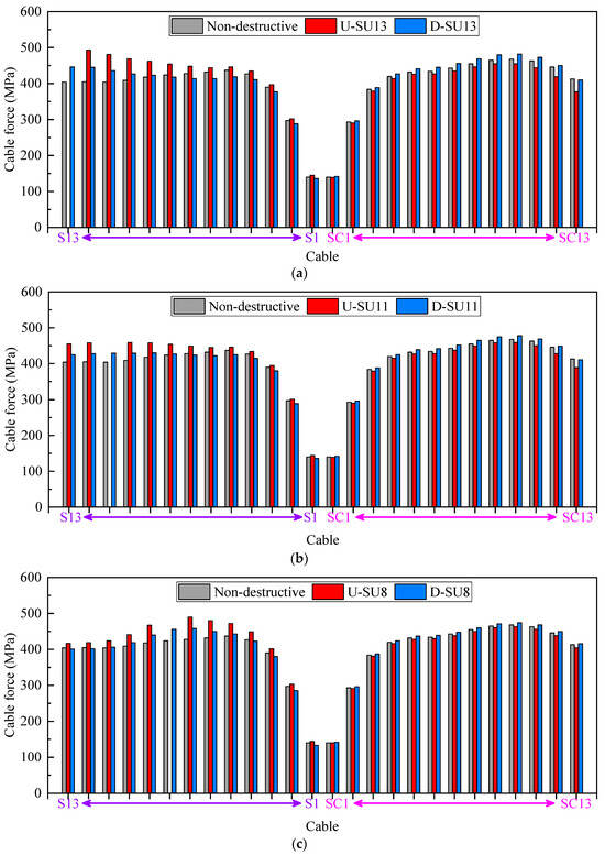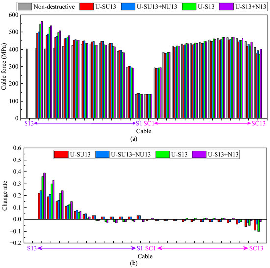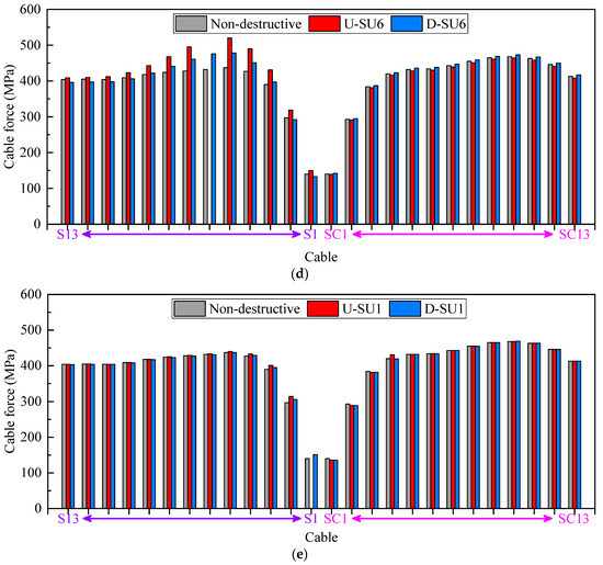 The cable has a relatively high initial stress, and when it is fused by fire, its stress will be redistributed, affecting the forces of other cables. This section is based on the symmetrical fusing mode of the side-span cable in Section 4.2.1, and explores the variation characteristics of other cable forces under the condition of one cable being fused. Table 6 shows the asymmetric fusing mode of the upstream cable on the south bank. Due to the asymmetry of the cable fusing with respect to the bridge centerline, there may be differences in the cable forces between the upstream and downstream. Therefore, the cable forces for the upstream and downstream are presented separately, and compared with the cable forces in the undamaged state. Figure 13 shows the cable force on both sides of the bridge after typical upstream cables (SU13, SU11, SU8, SU6, SU1) are fused. Figure 14 shows a schematic diagram of changes in cable force under cable fusing.
