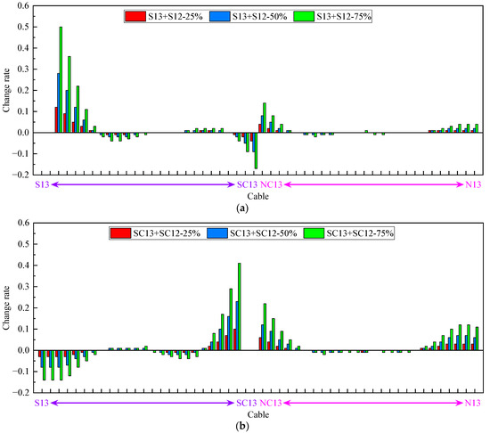 As can be seen in Figure 21, damage to the side-span and mid-span cables has an impact on the low and high-order frequency of the cable-stayed bridge, mainly changing the frequency of the vertical bending mode. Side-span cable damage mainly affects low-order frequency, while mid-span cable damage mainly affects high-order frequency. Although the stages of action are different, the maximum frequency change rate of the structure under side-span cable damage is greater than under mid-span cable damage. As the degree of damage to the cables increases, the amplitude of frequency changes in the structure gradually becomes apparent. When the side-span cable is damaged, the frequency change of the first symmetric vertical bending mode (second order) is the largest, with a maximum change rate of 14.8%, corresponding to the case where the damage degree of cables S13 + S12 reaches 100%, and the frequency of other modes significantly decreases. When the mid-span cable is damaged, the frequency change of the second-order symmetric bending mode (seventh order) is the largest, with a maximum change rate of 11.2%, followed by the frequency change of the first-order symmetric vertical bending mode (second order), with a maximum change rate of 5.5%.