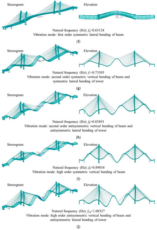 - The vibration mode of the bridge is the result of a combination of multiple vibration modes, with the beam mainly exhibiting vertical bending, and the bridge tower mainly exhibiting lateral bending. As the order of vibration modes increases, the higher-order modal changes become increasingly complex, leading to a continuous increase in the natural frequency of cable-stayed bridges.