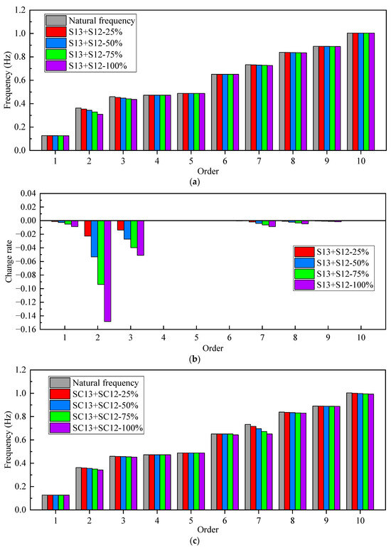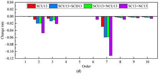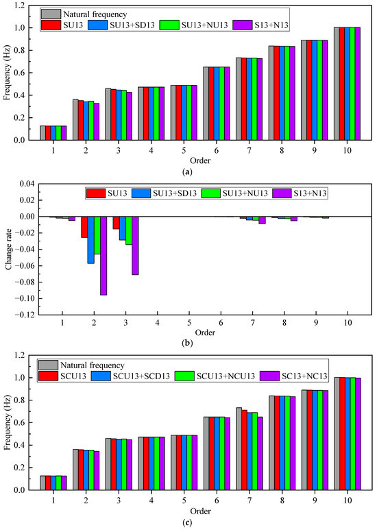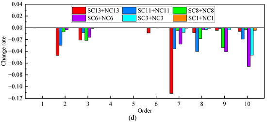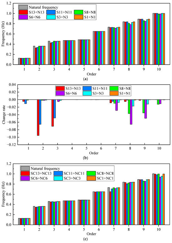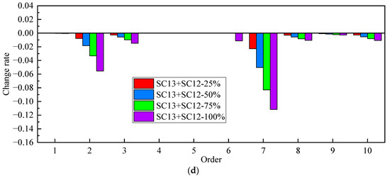 As can be seen in Figure 19a,b, the frequency change of the cable-stayed bridge is relatively small, and the maximum frequency variation does not exceed 10%. Side-span cable fusing has an impact on the vertical bending vibration mode of cable-stayed bridges, but has a relatively small impact on the longitudinal and lateral bending vibration modes. The upper and middle cables of the bridge tower are the main influencing factors. The upper cables of the side span have a significant impact on the low-order frequency of the bridge. Among them, when cables S13 + N13 are fused, this has the greatest impact on the frequency of the first-order symmetric vertical bending and first-order antisymmetric vertical bending modes (second and third order), with a maximum change rate of 9.6%. The middle cables of the side span have a significant impact on the high-order frequency of the bridge. Among them, the fusing of cables S6 + N6 has the greatest impact on the frequency of second-order antisymmetric vertical bending and high-order symmetric vertical bending modes (eighth and ninth order), with a maximum change rate of 6.6%. As can be seen in Figure 19c,d, the maximum frequency change of the cable-stayed bridge exceeds 10%. The fusing of mid-span cables also has a significant impact on the vertical bending vibration mode of the bridge, but has no effect on the longitudinal floating and lateral bending vibration modes. Both the upper and middle cables of the mid span have a significant impact on the high-order frequency of the bridge. Among them, when cables SC13 + NC13 are fused, this has the greatest impact on the frequency of the second-order symmetric vertical bending modes (seventh order), with a maximum change rate of 11.2%. When cables S6 + N6 are fused, this has the greatest impact on the frequency of high-order antisymmetric vertical bending modes (tenth order), with a maximum change rate of 6.6%.