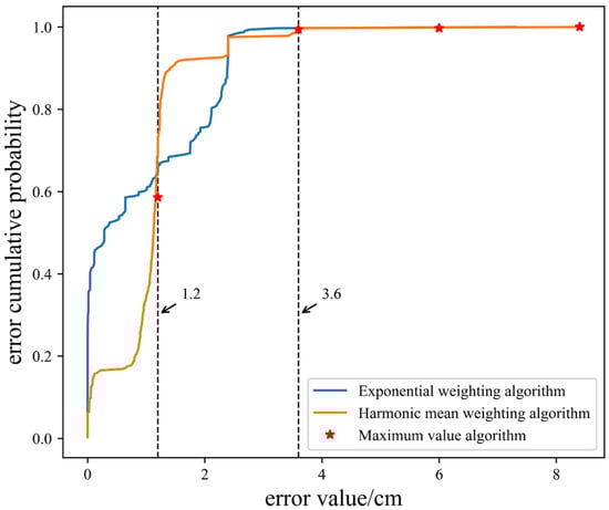 To further analyze the accuracy performance between various positioning algorithms, Figure 6 presents the error CDF diagram for three different positioning algorithms when using the LALT scheme. Since the maximum value algorithm can only position the antenna to a specific tag on the strip, the error CDF diagram for the maximum value algorithm can only be plotted in the form of star scatter points. As can be seen from the error CDF diagram, the GAR of the three positioning algorithms is almost the same. Both weighting algorithms have higher AR than the max algorithm. By assigning weights to multiple detected RFID tags, the weighting algorithms can eliminate random interference and noise encountered during RFID measurement to enhance positioning accuracy. Although the AR of the harmonic mean weighting algorithm is slightly higher by 5% compared to the exponential weighting algorithm, within the beginning of the error range, especially the error range of 0–1 cm, the error CDF for the exponential weighting algorithm is significantly higher than that of the harmonic mean weighting algorithm. This indicates that the positioning error of the exponential weighting algorithm is more concentrated within the beginning of the error range. In other words, the exponential weighting algorithm has a significantly higher positioning accuracy within the error range of 0–1 cm. Therefore, the exponential weighting algorithm demonstrates a clear advantage in the positioning error CDF than the other two algorithms.