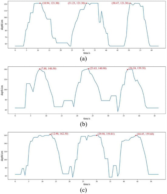 At the vibration construction site, three different vibration depths of 120 cm, 140 cm, and 160 cm were selected. At each depth, three vibration points were chosen for testing the depth monitoring performance. Figure 9 presents the time-history data of vibration depth monitoring at the three different depths. For each depth, three consecutive vibration depth changes can be clearly observed. The maximum depth value monitored of each vibration and its corresponding time are marked in the figure.
