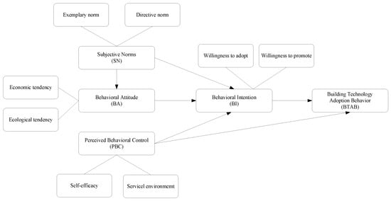 The theory of planned behavior (TPB) explains the process of individual decision-making behavior from the perspective of information processing and the expected value theory, which is widely used to study people’s complex behavioral intentions []. Scholars have introduced the theory of planned behavior into the study of rural residents’ social behavioral intentions, such as rural environmental governance [,], rural settlement organization [], application of fertilization technology [], entrepreneurial willingness [] and digital construction []. It has also been applied to the study of rural residents’ willingness to adopt building energy-saving technology.