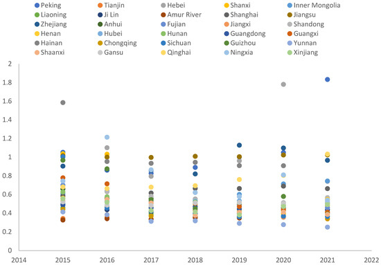 Secondly, in terms of individual provinces, only six provinces in China achieved effective DEA scores in 2015, while the number remained below five in other years. As depicted in Figure 2, from 2015 to 2021, a limited number of provinces were able to reach the production frontier. The building safety efficiency value of most provinces ranged between 0.2 and 0.6, indicating substantial room for improvement. By optimizing effective technical conditions and resource utilization, the input of safety efficiency factors can be enhanced, leading to the goals of increased economic output, reduced safety accidents, and lower mortality rates. This, in turn, effectively improves safety efficiency [42]. Among provinces, those at the forefront of social development such as Beijing exhibit effective construction safety efficiency, indicating a reasonable allocation of resources input and output. From this observation, it is evident that the construction industry in China possesses substantial potential for enhancing resource allocation and utilization. Simultaneously, the level of safety technology management and control mechanisms also necessitates further optimization and improvement. From 2015 to 2021, the building safety efficiency values of different provinces exhibited varied trends, including upward, downward, and fluctuating trends. Specifically, 15 provinces displayed a declining trend, namely Shanxi, Shandong, Guizhou, Sichuan, Guangxi, Zhejiang, Fujian, Anhui, Hunan, Jiangxi, Chongqing, Hainan, Yunnan, Shaanxi, and Ningxia. On the other hand, five provinces demonstrated an upward trend, namely Beijing, Inner Mongolia, Heilongjiang, Shanghai, and Qinghai. The remaining provinces exhibited varying degrees of fluctuation.