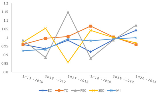 Malmquist index and its decomposition from 2015 to 2021.