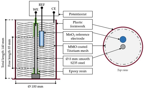 For each binder type, three cylindrical mortar specimens were produced, according to the three-electrode setup shown in Figure 1.