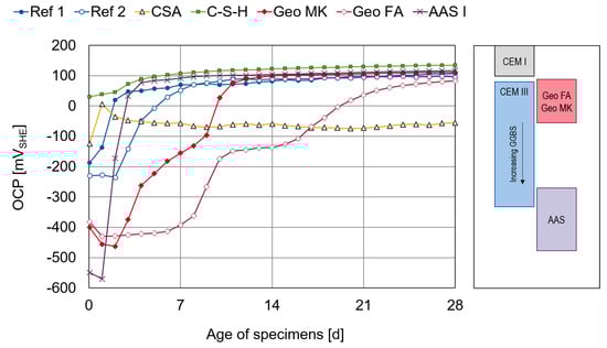 The most negative potentials at the beginning are observed in the AAS specimens. The potential increases and reaches almost stable values within 5 to 7 days, with similar values to the other binders, apart from CSA. This behavior is not typical for AASs, where more negative values can be expected, as seen in the potential ranges marked next to the graph [,].