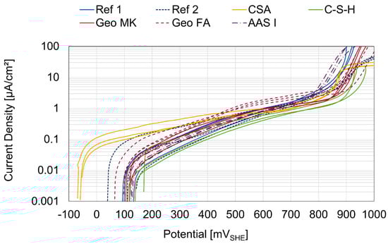 The anodic current density plots of all 21 specimens at the age of 28 days are shown in Figure 3. The potentials are converted to the standard hydrogen scale and corrected by the influence of IR by calculating the potential shift with the measured current and the resistance with the minimum phase angle in the frequency range between 100 Hz and 10 kHz from the impedance spectra from the same day []. To calculate the current density, the surface area of the working electrode in contact with the mortar was used. The curves of all binder types follow the shape of a passive working electrode, with no breakthrough potential up to the oxygen evolution potential at around 850 mVSHE. This behavior is consistent with the description of passive steel in mortar seen in []. The current density curves for the Geo FA specimens show a slight increase after 400 mVSHE. This could indicate a corrosion activity but the slope is low, however, so this is more likely to be attributed to generalized corrosion rather than to pitting. The shape of the AAS I polarization curves does not show the deviation from other binder types, which is sometimes observed in sulfide-containing media [,].