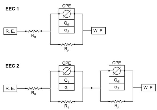 Equivalent electric circuits used to fit the EIS data.