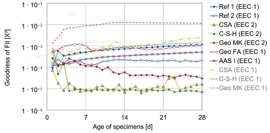 Most of the binder types showed the typical Randles shape but with a deformed semicircle, probably due to inhomogeneities in the steel mortar interface. Therefore, a constant phase element (CPE) instead of an ideal capacitor was used [,]. These inhomogeneities can be variations of the properties along the electrode surface or in a direction normal to the surface []. In a first attempt, all impedance spectra were fitted with the EEC 1. For CSA, C-S-H and Geo MK, the fit quality of EEC 1 was worse than for the Ref 1 specimens, therefore a second CPE and Ohmic resistance in parallel were added, to take care of additional effects in the frequency range between 10 mHz and 100 Hz. For the C-S-H, this influence is visible in the Nyquist plot (see Figure A4), where the beginning of the semi-circle follows a different pattern to the expected curve. This was the same for CSA. In the Geo MK specimens, an additional effect becomes more obvious in the Bode plot, where the phase shows additional turning points between 10 mHz and 100 Hz (see Figure A5). Capacitive influences in the frequency range over 1 kHz were not considered. The quality of the fits with the different EECs over time is shown in Figure 6 as a mean value of three specimens. The fit results of EEC 1, which were discarded for some binder types (dashed lines and gray legend entries), were not included in the following graphs of the fit results but were used to check the comparability of the parameters from the different EECs.