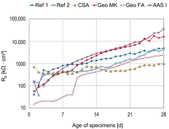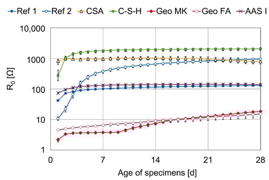 The highest R0 from day 3 onwards is observed in the C-S-H series, followed by CSA. In the case of CSA, the high resistance is caused by a pore solution with comparably low conductivity; in the case of C-S-H, a dense microstructure causes this high electric resistance [,,]. The R0 values of the investigated geopolymers are very low, which is also consistent with the literature findings [,,].