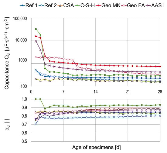 The fit results for the capacitances Qdl and the corresponding αdl as mean values of three specimens are shown in Figure 8. To assess the quantitative information, effective capacitances would be necessary [,], but the change of the values over time is also valuable; corresponding to the increase in the OCP values, the Qdl values decrease during passivation []. For most of the binders, this drastic change happens in the first few days. Just the Geo FA specimens show a different behavior and the capacitance drops after 9 days, which supports the assumption of delayed passivation. Another exception is series CSA, where, analogous to the OCP measurements, no distinct trend is obvious. The values of αdl are between 0.75 and 1.0. For α = 1, the CPE is estimated to be an ideal capacitor; for α = 0, the CPE behaves like an Ohmic resistance and α = 0.5 can be attributed to diffusion processes [,,,]. So, the values determined here confirm the estimation of capacitive behavior.