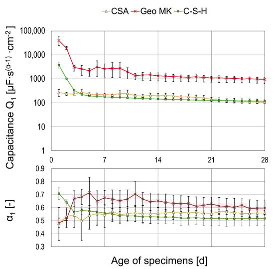 The fit results for the second CPE are shown in Figure 10 for three different binder types, where EEC 2 was used. For α = 1, the CPE is estimated to be an ideal capacitor; for α = 0, the CPE behaves like an Ohmic resistance and α = 0.5 can be attributed to diffusion processes [,,,]. It is, therefore, assumed that diffusion processes influence the system in the cases of CSA and C-S-H, whilst a layer formation with mainly capacitive properties is possible for Geo MK.
