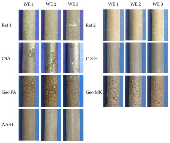 Pictures from the working electrodes after the tests are shown in Figure 11. No signs of corrosion were observed in the Ref 1, Ref 2, C-S-H and AAS I mortars. A few scattered corrosion spots were observed on the steel surface of the CSA mortars. The geopolymers Geo FA and Geo MK showed shallow corrosion marks over the whole surface in contact with the mortar. Crevice corrosion was not observed in any of the specimens.