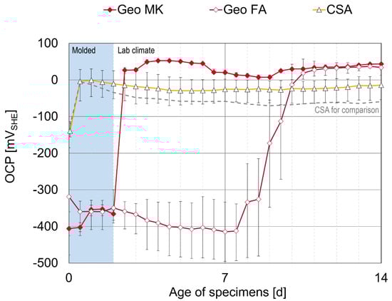 The potential values of the two geopolymers Geo MK and Geo FA show a delayed start of passivation and progress in two steps. Both reach the same value of OPC as the other binders, apart from CSA, but for the Geo MK it takes 12 days to reach a stable OCP and for the Geo FA the values are just starting to stabilize at the end of the measurement after 28 days. The plastic sheets have been removed from the specimens at the age of 7 days. This might have an influence on the passivation time of the geopolymers. Therefore, this was checked in an additional series of tests shown in Section 4, where the containers and plastic sheets were removed at the age of 2 days.