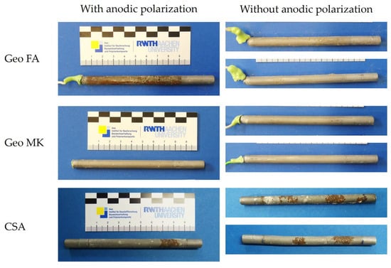 The pictures of the working electrodes after the additional tests are shown in Figure 13. The electrodes on the left side have undergone the anodic polarization test at the age of 14 days, those on the right side have not. The Geo MK electrodes do not show any corrosion spots, not even the polarized sample. This leads to the assumption that the passivation in the demolded specimens in a laboratory climate was more protective than in the molded specimens. At the Geo FA electrodes, corrosion only occurred on the polarized sample, which indicates that the corrosion happened due to the high polarization over a certain time. The description of the polarization curves (Section 3.1, Figure 3) suggests that these corrosion phenomena took place at a potential above 400 mVSHE. The generalized corrosion can be an effect of a passivation layer that is still weak, because passivation has been delayed. In addition, the polarization can cause a movement of OH− ions away from the working electrode, leading to a decrease in pH at the steel surface. In a rapid migration test on this mortar, comparatively low voltages and short test durations were sufficient to allow chloride ions to migrate into the mortar [], which indicates that OH− ions may also migrate more easily in this mortar than in mortars made from other binder types.